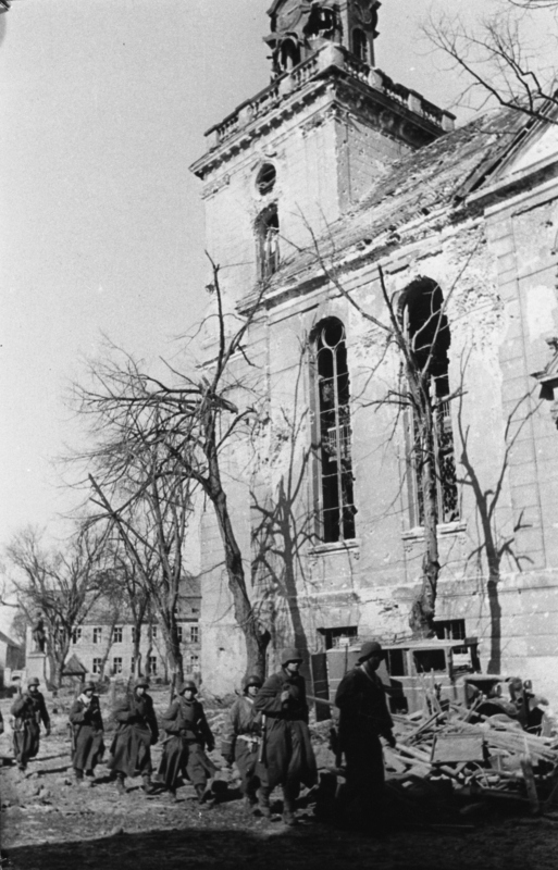 Deutsche Infanterie beim Durchmarsch durch die Küstriner Altstadt (März 1945) Quelle: Bundesarchiv Bild 146-1981-093-04 Foto: ohne Angabe | |