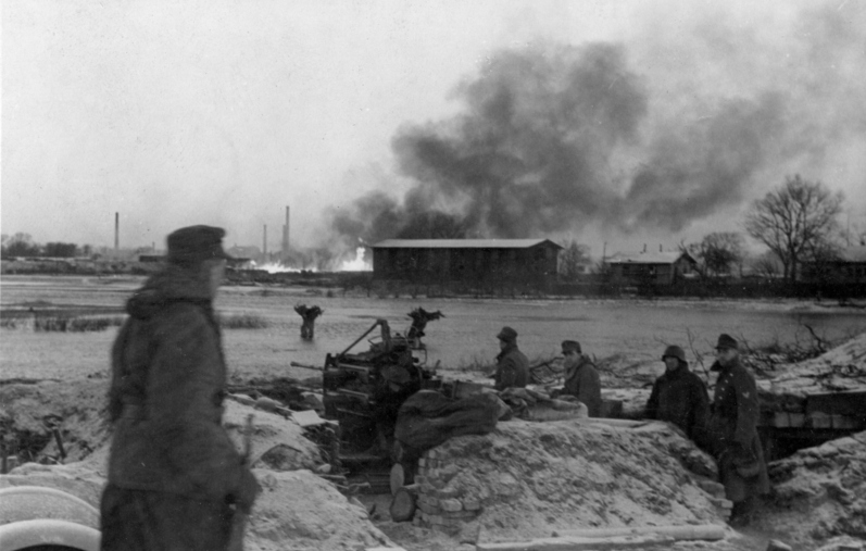 Flak am Ufer der Warthe, im Hintergrund die brennende Neustadt. (7.3.1945) Quelle: Bundesarchiv Bild 146-1990-060-02 Foto: o.A. |