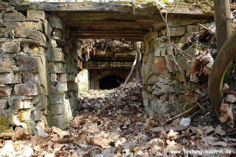 beseitigt um eine flachere Silouette zu bilden. Die Schießscharten des Reduits wurden zu Fenstern ausgebaut und der direkte Zugang von der Zugbrücke zum Reduit verschlossen. Der Keller wurde zugeschüttet. Die Wälle sollten Bestandteil einer Batteriestellung bleiben. In den 20er Jahren des 20.Jh. nutzte ein Küstriner Ruderverein das Gelände. In den schweren Abwehrkämpfen 1945 wurde die Lünette in das Verteidigungssystem integriert. Auf der Wallkrone der Face wurden MG-Stellungen und Laufgräben ausgehoben. Teile der Wälle, das Reduit und die Kehlmauer wurden durch Feindeinwirkung erheblich beschädigt. Nach 1945 wurde das Areal als Schießplatz durch die Sowjetarmee verwendet, die auch die nahegelegenen Gebäude der ehemaligen Artilleriekaserne nutze. Der Zugang zum Werk erfolgte nun über einen neu aufgeschüttenen Damm, da die hölzerne Brücke zerstört wurde. Das Pulvermagazin wurde als Lager für Gewehrmunition verwendet. Aus dieser Zeit sind noch Reste der für die Sowjetarmee typischen Wandbemalung erhalten. Rechts vom Pulvermagagzin wurde im 20.Jh ein Anbau aus Ziegelsteinen und Stahlträgern errichtet. Bisher konnte nicht nachvollzogen werden, warum dieser errichtet wurde. |