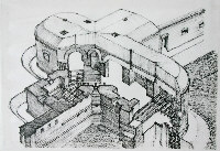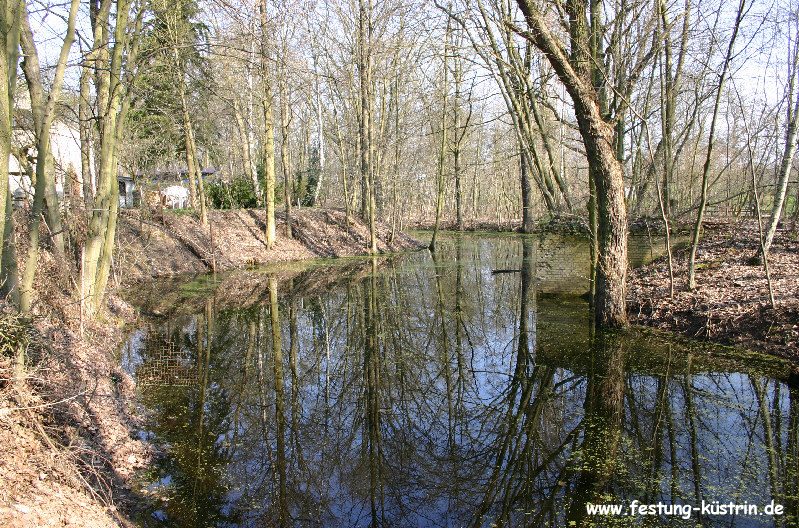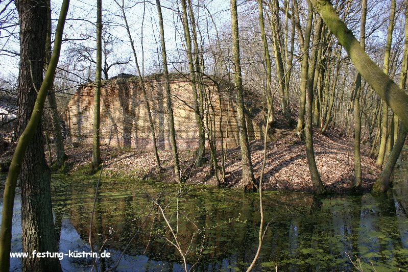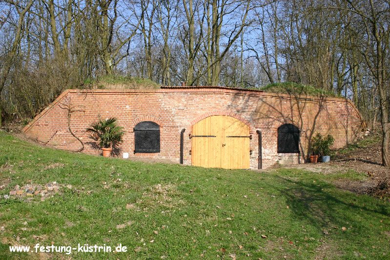 Die 1860-63 errichtete Lünette D sicherte zusammen mit der älteren Rechten Flügellünette die nördliche Flanke der Festung. Die Lünette hat die Form einer fünfeckigen halbrunden Route und ist als Einzige durch einem doppelten Wassergraben geschützt. Eine weitere Besonderheit ist ein Unterstand für die Geschützmannschaften im rechten Wallflügel. Für die Bereitschaftmunition waren dort zwei Munitionsnischen vorgesehen, die mit Stahltüren verschlossen werden konnten. Wie lange die militärische Nutzung dauerte ist nicht bekannt, jedoch blieb die Lünette D auch weiterhin Teil der militärischen Planung. 1928 wurde das Reduit gesprengt um eine flachere Silouette zu bilden. Die Geschützstände sollten auch weiterhin als Artilleriestellung verwendet werden. In den Abwehrkämpfen 1945 war die Lünette D schwer umkämpft und wurde bis zum Verschuß jeglicher Munition verteidigt. Bei den Kämpfen wurden das Munitionsmagazin zerstört und der Unterstand schwer beschädigt. | |