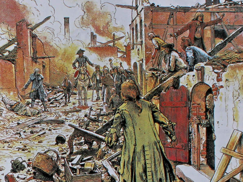 Im Zuge der militärischen Auseinandersetzungen im Siebenjährigen Krieg drangt die russische Armee, von Ostpreußen kommend, auf Brandenburg vor. Daraufhin wurde die Küstriner Garnison auf 2000 Mann verstärkt. Am 14. August 1758 besetzten preussische Truppen den Weinberg in der Nähe der kurzen Vorstadt, mußten sich aber gegen stärkere russische Verbände zurückziehen. Die russischen Verbänden errichteten dort und später in der Vorstand, völlig unbehelligt von der Festungsbesatzung, Belagerungsbatterien um am 15.August Stadt zu beschießen. Die Festungsbesatzung antworte ihrerseits mit einer lebhaften Kanonade. Doch eines der ersten feindlichen Geschosse traf das Strohlager in der Hintergasse. Es entstand ein Brand, der nach kurzer Zeit auf die meist aus Fachwerk erbauten Häuser übergriff und die gesamte Stadt einäscherte. Lediglich drei Gebäude blieben erhalten. | |
