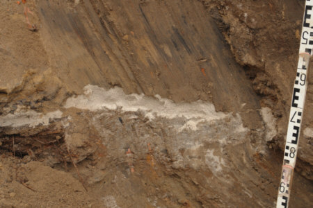 Bodenprofil in der Berliner Straße: Holzbohlen als Fußgängerweg, darüber die Schwemmsandschicht der Überschwemmung von 1736. 20cm darüber die Brandschicht von 1758 |